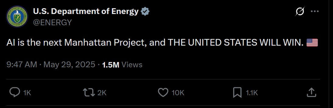 The Department of Energy—the part of the U.S. federal government which oversees its nuclear stockpile—posted that declaration on its X account the day after I learned I’d be an Outrider fellow. I'd spend the next two years reporting on the intersection of artificial intelligence and nuclear weapons and here was the DoE posting about my new beat.