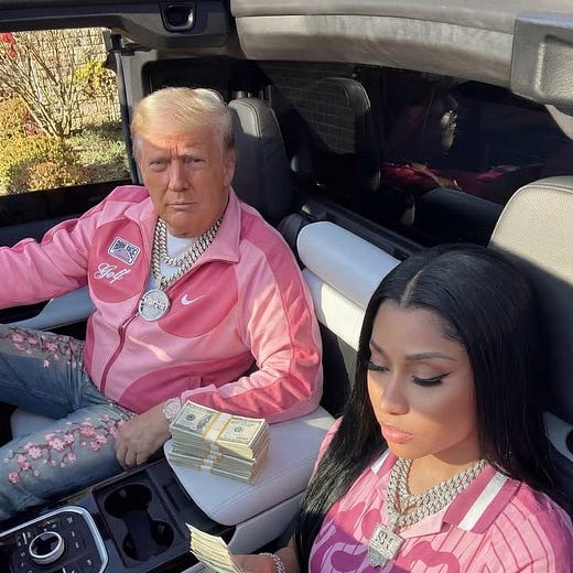 It was President’s day. Here’s a picture Nicki Minaj posted of herself sitting next to a pastel festooned AI-generated President Trump.